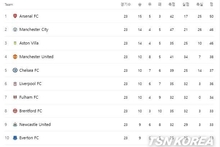 TSN KOREA 김민제 기자 | 잉글랜드 프로축구 프리미어리그(EPL) 2025-2026 시즌이 중반부를 향해 가면서 우승 경쟁과 잔류 싸움이 동시에 달아오르고 있다. 지난 시즌 챔피언이었던 리버풀은 디펜딩 챔피언 자격으로 시즌을 시작했지만, 현재는 선두권과 다소 격차가 벌어진 상황이다. 현재 순위표 최상단에는 아스널이 올라 있다. 아스널은 안정적인 수비 조직력과 빠른 전환을 앞세워 승점을 꾸준히 쌓으며 우승 경쟁의 중심에 섰다. 그 뒤를 맨체스터 시티와 아스톤 빌라가 바짝 추격하고 있다. 맨체스터 시티(맨시티)는 펩 과르디올라 감독 체제 아래 여전히 리그 최강의 공격력을 유지하고 있으며, 아스톤 빌라는 시즌 최대 다크호스로 평가받는다. 중상위권에서는 맨체스터 유나이티드(맨유), 첼시, 그리고 리버풀이 유럽대항전 진출권을 두고 치열한 순위 다툼을 이어가고 있다. 최근 라운드에서는 중위권 팀들의 승점 경쟁도 치열했다. 에버턴은 홈 경기에서 승점을 챙기며 하위권 탈출의 실마리를 찾았고, 뉴캐슬과 브렌트퍼드 역시 경기력 기복 속에서 순위 변동을 반복하고 있다. 강등권에서는 번리와 울버햄프턴이 어려운 흐름을 이어가고 있다. 남은 일정에서 반등의 계기를 만들지 못할