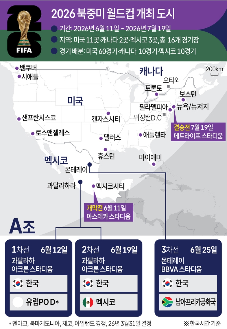 한국의 조별리그는 과달라하라(고지대)에서 1·2차전, 몬테레이(고온다습)에서 3차전이 열린다.