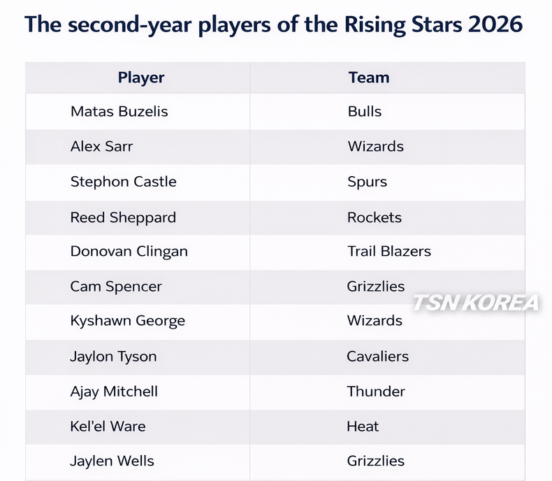 TSN KOREA 박영우 기자 | 미국 프로농구 NBA가 26일(현지시간) 2026 올스타 주말의 포문을 여는 ‘캐스트롤 라이징 스타즈 챌린지’ 참가 선수 명단을 공식 발표했다.