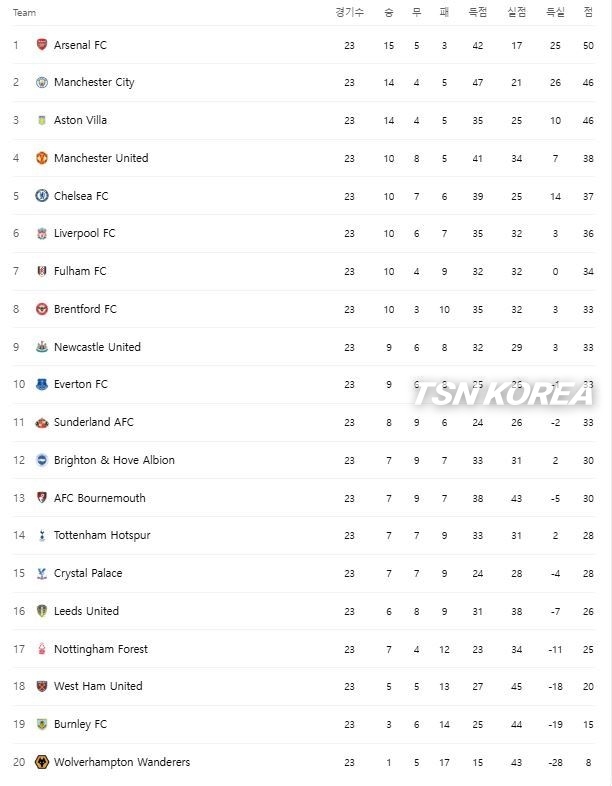현재 순위표 최상단에는 아스널이 올라 있다. 아스널은 안정적인 수비 조직력과 빠른 전환을 앞세워 승점을 꾸준히 쌓으며 우승 경쟁의 중심에 섰다. 그 뒤를 맨체스터 시티와 아스톤 빌라가 바짝 추격하고 있다.