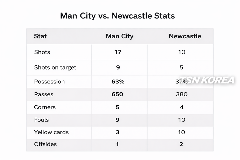 전반 33분에는 티야니 레인더르스가 추가골을 터뜨리며 맨시티의 우세는 더욱 확고해졌다. 반면 뉴캐슬은 에디 하우 감독의 백파이브 선택이 초반부터 흔들리며 악수가 됐다. 번의 무리한 태클에서 비롯된 첫 실점 이후 수비 라인은 급격히 무너졌고, 중원에서도 수적 열세를 극복하지 못했다.