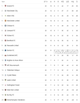 EPL 프리미어리그 2025/26 시즌, 최신 순위...1위 아스널, 2위 맨시티