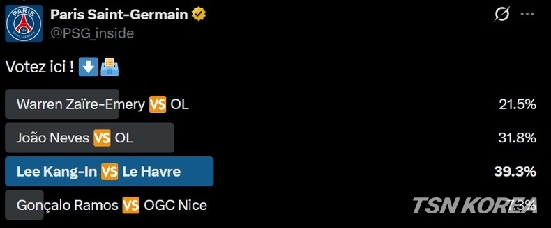 PSG는 3일(현지시간) SNS를 통해 진행한 투표 결과 이강인의 득점이 총 1천198표 중 39.3%를 얻어 1위를 차지했다고 밝혔다.