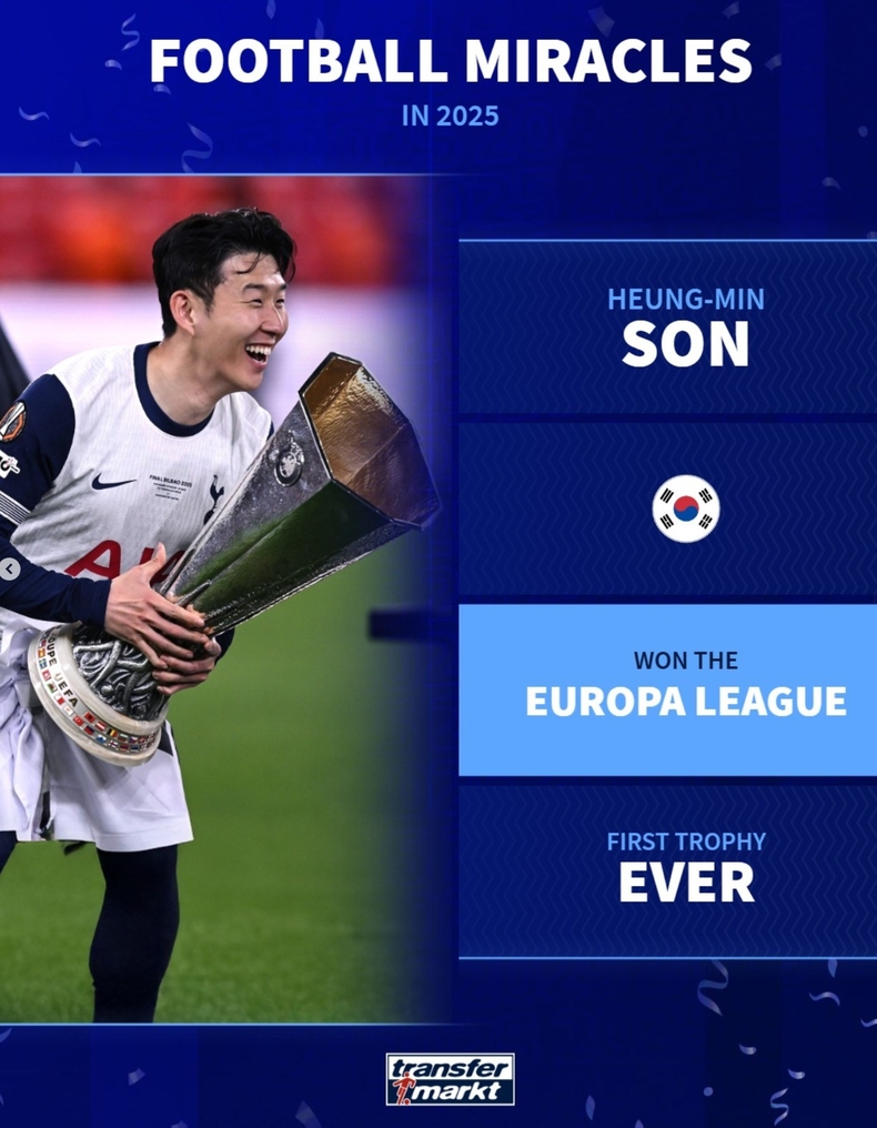 독일의 축구 이적·통계 전문 매체 트랜스퍼마르크트는 25일(현지시간) ‘2025년 축구계 8대 기적’을 발표하며 손흥민의 유로파리그 우승을 주요 사례로 꼽았다.