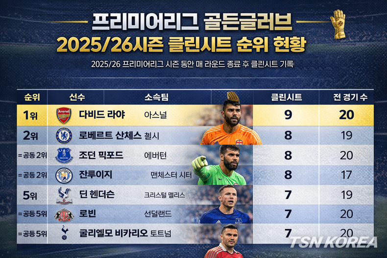 라야를 바짝 추격하는 선수는 로베르트 산체스다. 첼시의 산체스는 19경기에서 8클린시트를 기록하며 경쟁 구도를 형성했다. 시즌 초반 기복을 줄이며 안정감을 끌어올린 점이 눈에 띈다.