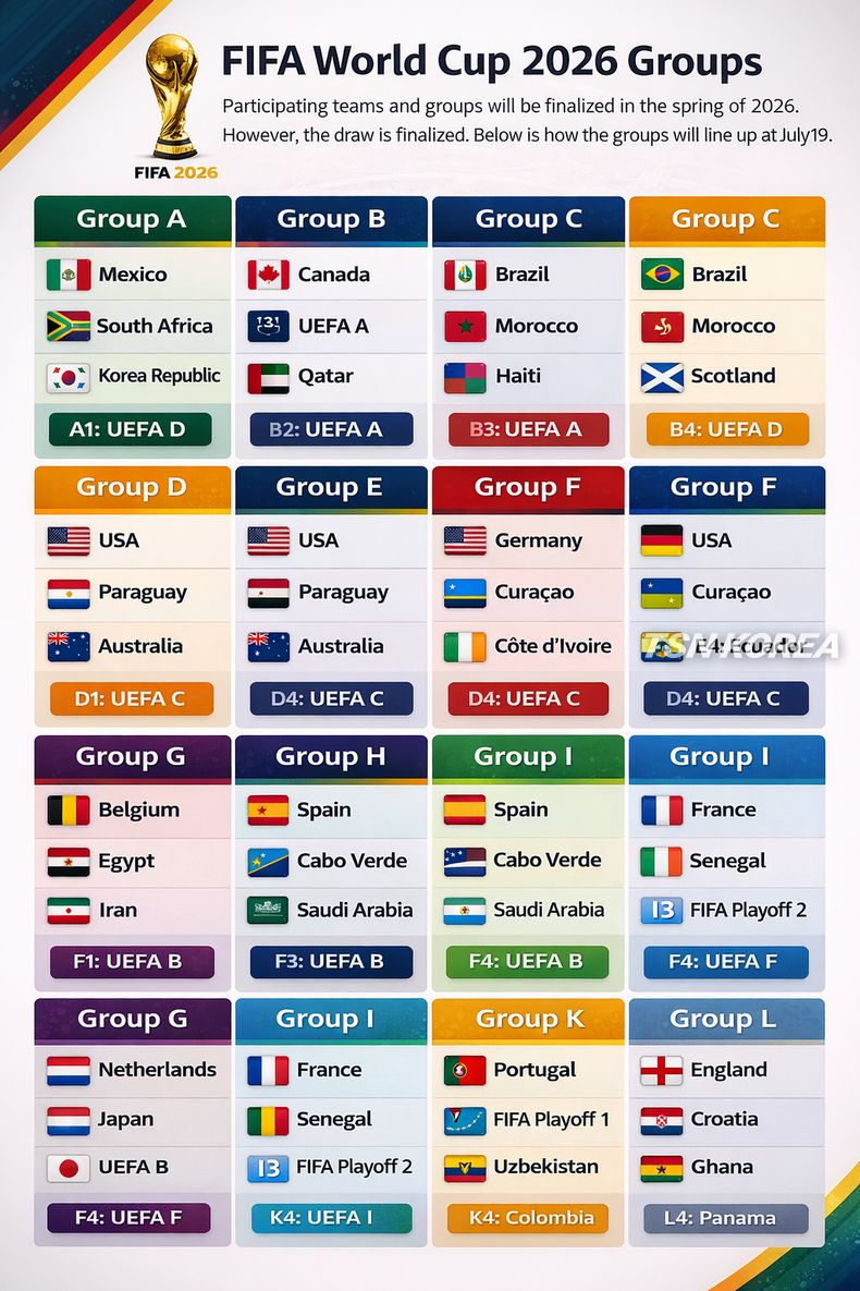 조 편성은 사전 배정 구조가 확정된 상태이며, 최종 참가국은 2026년 봄 예선을 통해 모두 결정된다. 개최국 미국과 캐나다, 멕시코는 각 조 시드를 배정받아 조별리그에 나선다.
