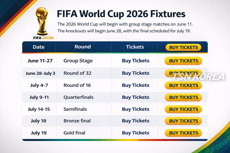 TSN KOREA 임재현 기자 | 2026 국제축구연맹(FIFA) 월드컵이 북미 대륙에서 열린다. 오는 6월 11일 조별리그 개막으로 시작해 7월 19일 결승전까지 약 5주간 진행된다.