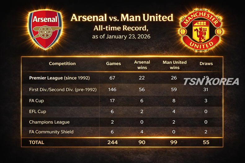 프리미어리그와 1·2부 리그를 합산한 리그 전적에서 맨유는 99승, 아스널은 90승을 기록 중이다. 챔피언스리그 맞대결에서도 맨유가 2전 2승으로 우위를 점하고 있다.