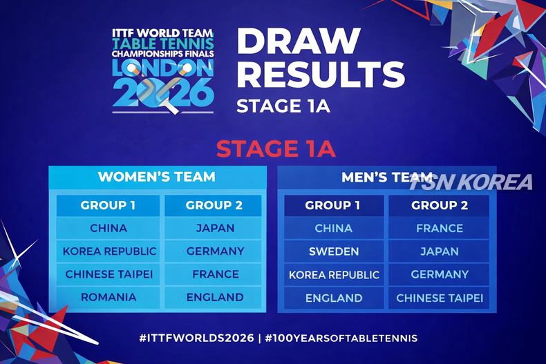 TSN KOREA 장우혁 기자 | 2026 국제탁구연맹(ITTF) 세계탁구선수권대회 단체전에서 한국 남녀 대표팀이 모두 세계 최강 중국과 같은 1그룹에 배정됐다.