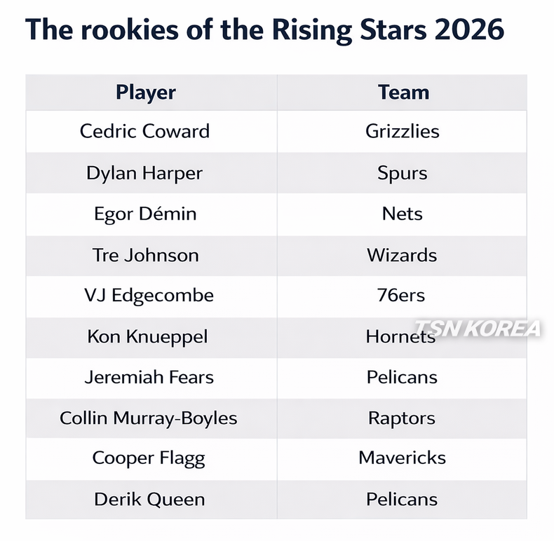 TSN KOREA 박영우 기자 | 미국 프로농구 NBA가 26일(현지시간) 2026 올스타 주말의 포문을 여는 ‘캐스트롤 라이징 스타즈 챌린지’ 참가 선수 명단을 공식 발표했다.