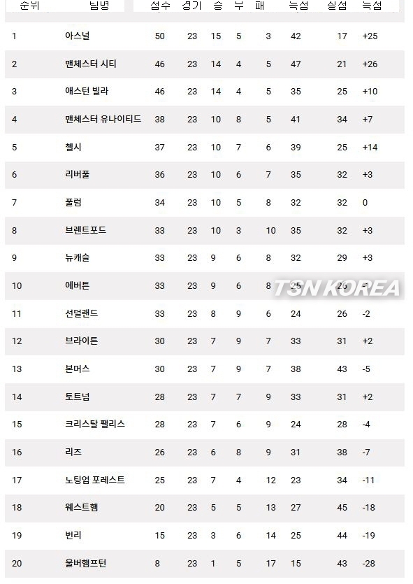 현재 순위표 최상단에는 아스널이 올라 있다. 아스널은 안정적인 수비 조직력과 빠른 전환을 앞세워 승점을 꾸준히 쌓으며 우승 경쟁의 중심에 섰다. 그 뒤를 맨체스터 시티와 아스톤 빌라가 바짝 추격하고 있다.
