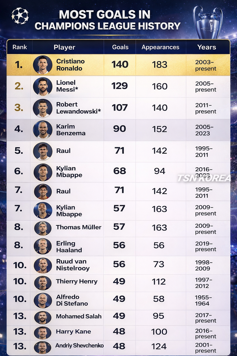 TSN KOREA 박영우 기자 | 유럽축구연맹(UEFA) 챔피언스리그는 수많은 명승부와 함께 시대를 대표하는 골잡이들을 배출해왔다. 대회 역사 속에서 기록된 득점 수치는 선수의 커리어를 평가하는 핵심 지표로 자리 잡았다.