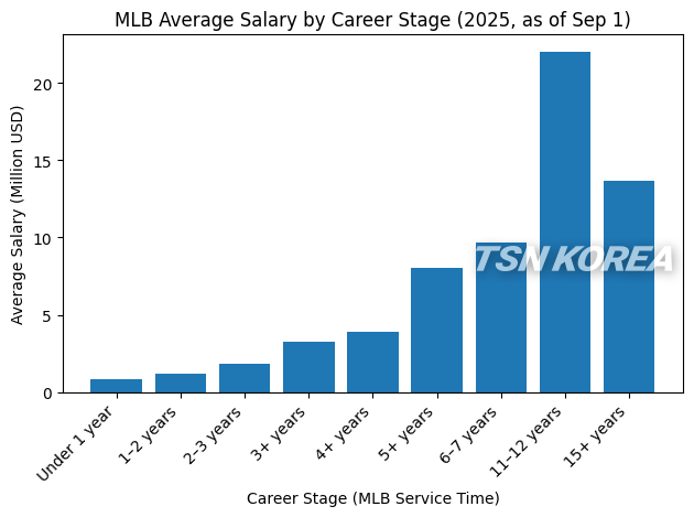 AP통신은 3일 MLB 선수노조 자료를 인용해, 2025시즌 9월 1일 기준 빅리그 로스터에 등록된 선수 1천46명의 평균 연봉이 472만1천393달러로 집계됐다고 전했다. 원화로 환산하면 약 68억원 수준이다.