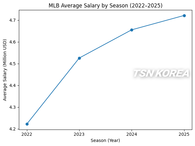 MLB 평균 연봉은 코로나19 여파로 단축 시즌이 치러진 2021시즌 이후 4시즌 연속 상승세를 이어갔다.