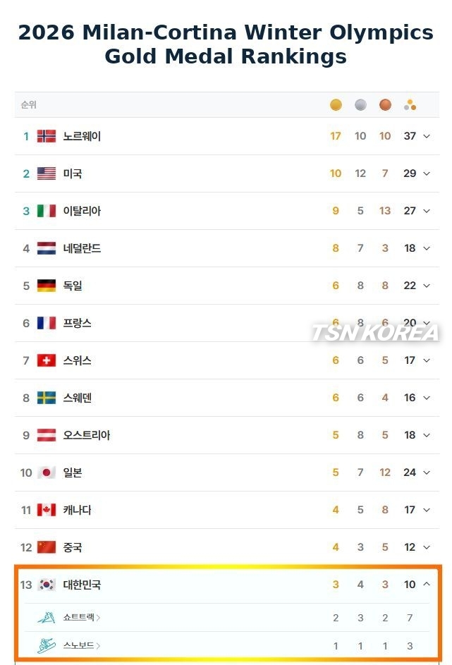 TSN KOREA 박영우 기자 | ■ 2026 밀라노·코르티나 동계 올림픽 금메달 국가 순위