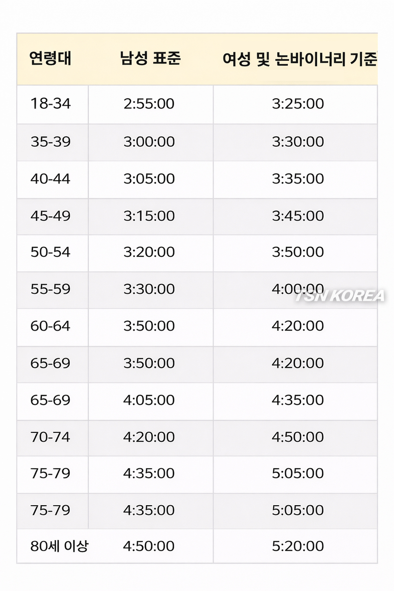 보스턴 마라톤 예선 시간 기록은 연령에 따라 다르다. 올해 18세~34세 남성은 2시간 55분 이하의 기록이 필요했고, 여성과 80세 이상 논바이너리 러너는 5시간 20분 이하의 기록이 필요했다.