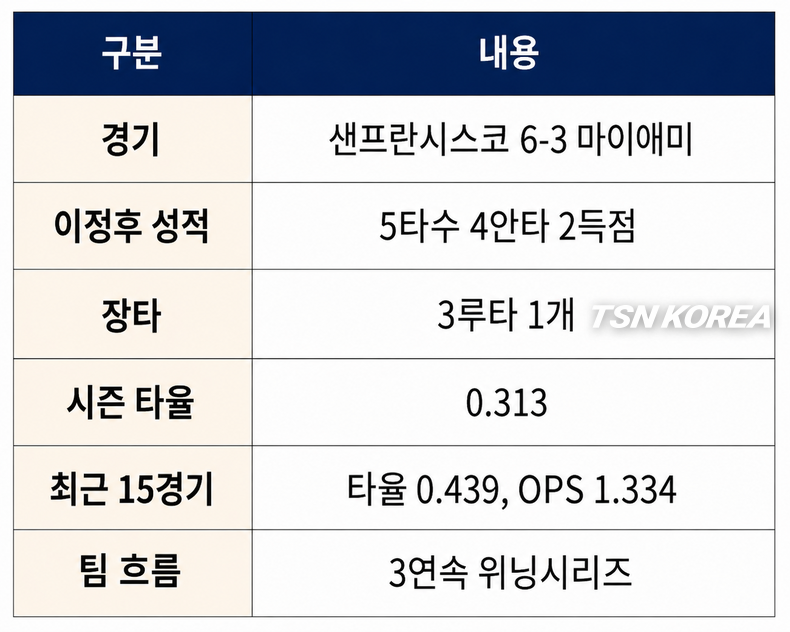 이정후가 이날 경기에서 공격의 흐름을 만들었다는 점은 분명하다. 부진을 벗어난 이정후는 이제 샌프란시스코 타선의 보조 전력이 아니라 반등을 여는 핵심 카드로 자리 잡고 있다.