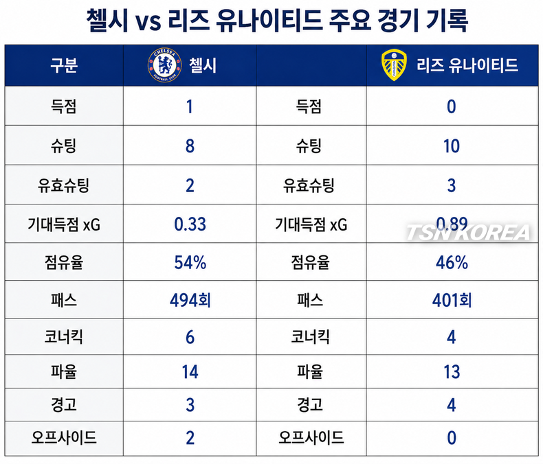경기 흐름은 첼시가 먼저 잡았다. 첼시는 전반부터 중원 압박과 측면 전개로 리즈의 수비 간격을 흔들었다. 결승골 장면도 리즈 수비수 파스칼 스트라위크가 공을 빼앗긴 뒤 만들어졌다. 주앙 페드루가 압박으로 소유권을 되찾았고, 네투의 크로스와 페르난데스의 헤더가 이어졌다.