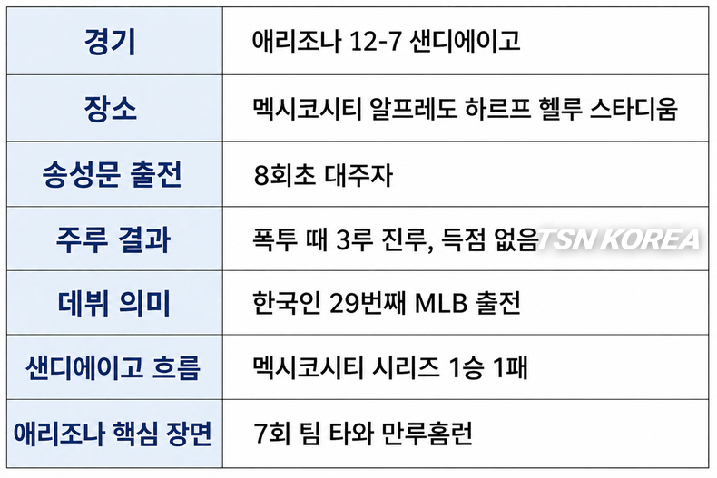 샌디에이고는 멕시코시티 시리즈 특별 규정에 따라 로스터를 한 명 확대할 수 있었고, 이 과정에서 송성문을 빅리그 명단에 포함했다. 현지 보도도 송성문이 멕시코시티 시리즈를 통해 메이저리그 데뷔 기회를 잡았다고 전했다.