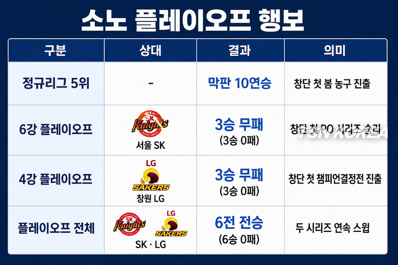 소노의 질주는 이변을 넘어 기록이 됐다. 정규리그 5위로 봄 농구에 진출한 소노는 6강 플레이오프에서 서울 SK를 3전 전승으로 제압했다.