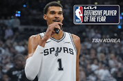 TSN KOREA 송은하 기자 | 빅터 웸반야마(샌안토니오 스퍼스)가 미국프로농구(NBA) 역사에 또 하나의 이정표를 세웠다. 웸반야마는 2025-2026시즌 기아 NBA 올해의 수비수상(DPOY)을 만장일치로 수상했다. 이 상이 제정된 이후 첫 만장일치 수상자로 이름을 올렸으며, 동시에 22세의 나이로 역대 최연소 수상 기록도 새로 썼다. NBA 공식 발표에 따르면 웸반야마는 압도적인 수비 영향력을 앞세워 리그 최고 수비수로 인정받았다. 지난해 수상 자격 기준인 65경기를 채우지 못해 후보 경쟁에서 밀렸을 뿐, 실제 기량만 놓고 보면 이미 정상급 수비수였다는 평가를 했다. 수상 발표 직후 웸반야마는 NBC 방송 인터뷰에서 기쁨을 숨기지 않았다. 그는 “정말 기분이 좋다”며 “가장 큰 과제는 65경기를 채우는 것이었을지 모른다. 이 상을 받게 돼 매우 행복하고, 사상 첫 만장일치 수상자라는 점이 특히 자랑스럽다”고 밝혔다. NBA는 해당 인터뷰 영상을 공식 채널을 통해도 소개했다. 웸반야마의 수상은 일회성 성과로 보기 어렵다는 전망도 나온다. 그는 올 시즌 경기당 3.1개의 블록슛으로 리그 정상급 림 프로텍터 역할을 해냈고, 가드와 포워드, 센터를 가리지 않
