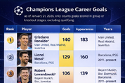 TSN KOREA 김민제 기자 | 유럽축구연맹(UEFA) 챔피언스리그는 세계 최고 권위의 클럽 대항전으로 평가받는다. 이 대회에서의 득점은 곧 선수의 위상을 상징하는 지표로 여겨진다. 골을 통해 팀을 정상으로 이끈 선수들은 시대를 대표하는 전설로 기록됐다. 역대 챔피언스리그 단일 시즌 최다 득점 기록은 크리스티아누 호날두가 보유하고 있다. 그는 레알 마드리드 소속이던 2013-14시즌 11경기에서 17골을 기록하며 팀의 우승을 이끌었다. 조별리그부터 토너먼트까지 거의 모든 경기에서 득점에 성공했고, 이 기록은 10년이 넘도록 깨지지 않고 있다. 호날두는 2015-16시즌에도 16골을 넣으며 자신의 기록에 근접했다. 이 시기 그는 유럽 무대에서 독보적인 결정력을 과시했고, 챔피언스리그 역사상 가장 위력적인 공격수로 평가받게 됐다. 단일 시즌 득점 상위권에는 로베르트 레반도프스키와 카림 벤제마가 15골로 공동 기록을 세운 시즌이 포함돼 있다. 리오넬 메시는 2011-12시즌 14골로 바르셀로나의 공격을 이끌며 상위권에 이름을 올렸다. 최근에는 신세대 공격수들의 추격도 눈에 띈다. 킬리안 음바페는 2025-26시즌 리그 페이즈 7경기 만에 11골을 기록하며 역대